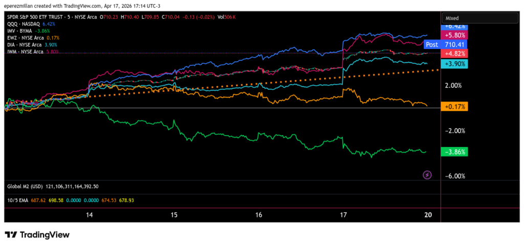 En velas vemos el semanal de SPY, Azul el QQQ, Naranja el EWZ, Verde el Merval, Rojo el Russell 2000 y celeste el DIA.