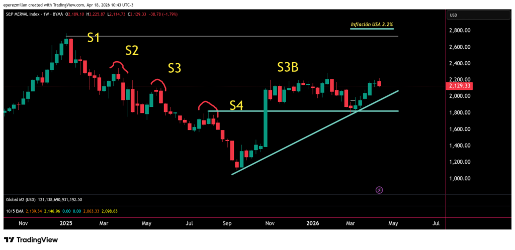 Podemos ver que se sostiene en precio lateral con una muy sutil estabilidad de volumen desde noviembre tras las elecciones. El rechazo al riesgo frente a tantos conflictos ha desviado el interés en los activos de alta especulación. Por el momento el Merval espera con movimientos de corto plazo ascendentes y descendentes a 32% de su mejor valor de Enero 2025 actualizado por inflación en USD. En el largo plazo, desde el Coronacrash sigue con una ganancia del 510%, esa fuerza sostiene el precio pero también puede estar purgándose y tomando ganancia sin dañar el precio, solo posible por los grandes fondos.