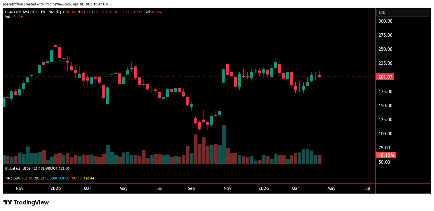 Aquí vemos el merval en USD semanal, notamos que la recuperación vía energía y conflicto en Medio Oriente termina justo en la zona de precios de la resistencia S3/S3B. El S3 fue un pico de liquidez y precio entendido como Salida 3 de toma de ganancias que inicio en enero de 2025. Aquí abajo vemos un nuevo gráfico de ADRs sumados como 1 acción de GGAL, YPF, BMA y TGS para analizar los volumenes: